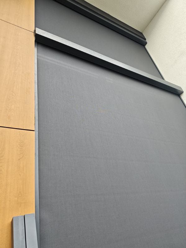 Inwestorzy szukali rozwiązania, które nie tylko zmniejszy temperaturę we wnętrzu, ale także nie pozbawi pomieszczenia naturalnego światła i widoku na zewnątrz. Idealnym wyborem okazały się rolety screen w kolorze antracyt, wykonane z ciemnoszarej tkaniny o strukturze mikrosiateczki. Dzięki perforowanej powierzchni materiału rolety skutecznie redukują promienie słoneczne i obniżają temperaturę wewnątrz nawet o 8–10°C, przy zachowaniu widoczności na zewnątrz.
